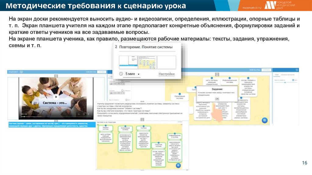 Методические требования к сценарию урокаНа экран доски рекомендуется выносить аудио- и видеозаписи, определения, иллюстрации, опорные таблицы и