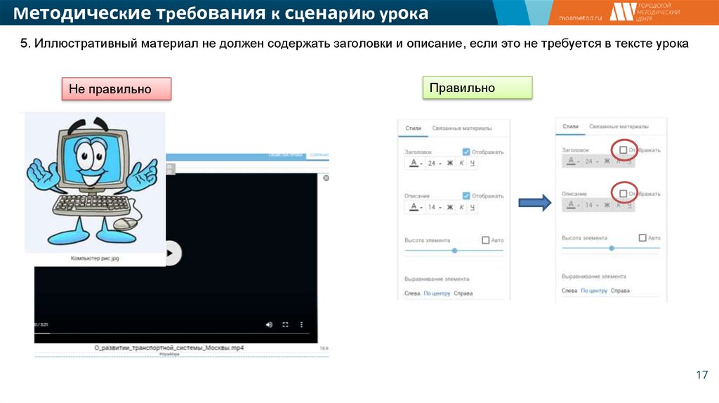 Методические требования к сценарию урока5. Иллюстративный материал не должен содержать заголовки и описание, если это не требуется в тексте урока