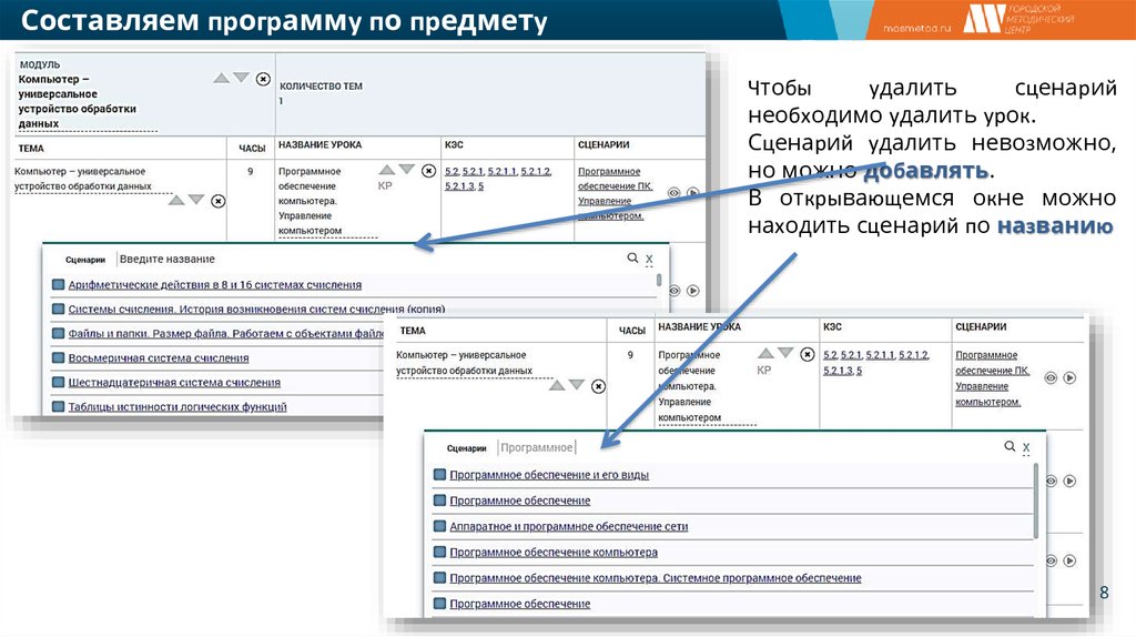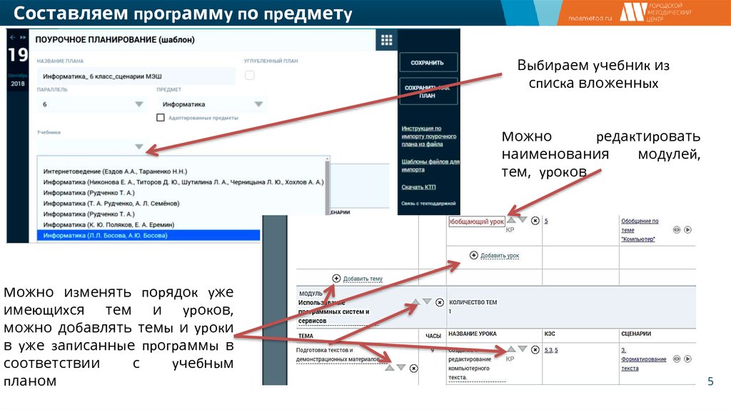Составляем программу по предметуК каждому уроку подобран сценарий, который можно просмотреть либо с помощью средств