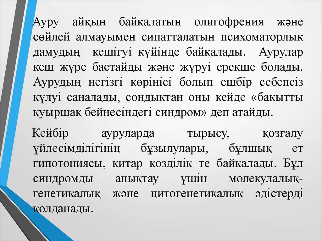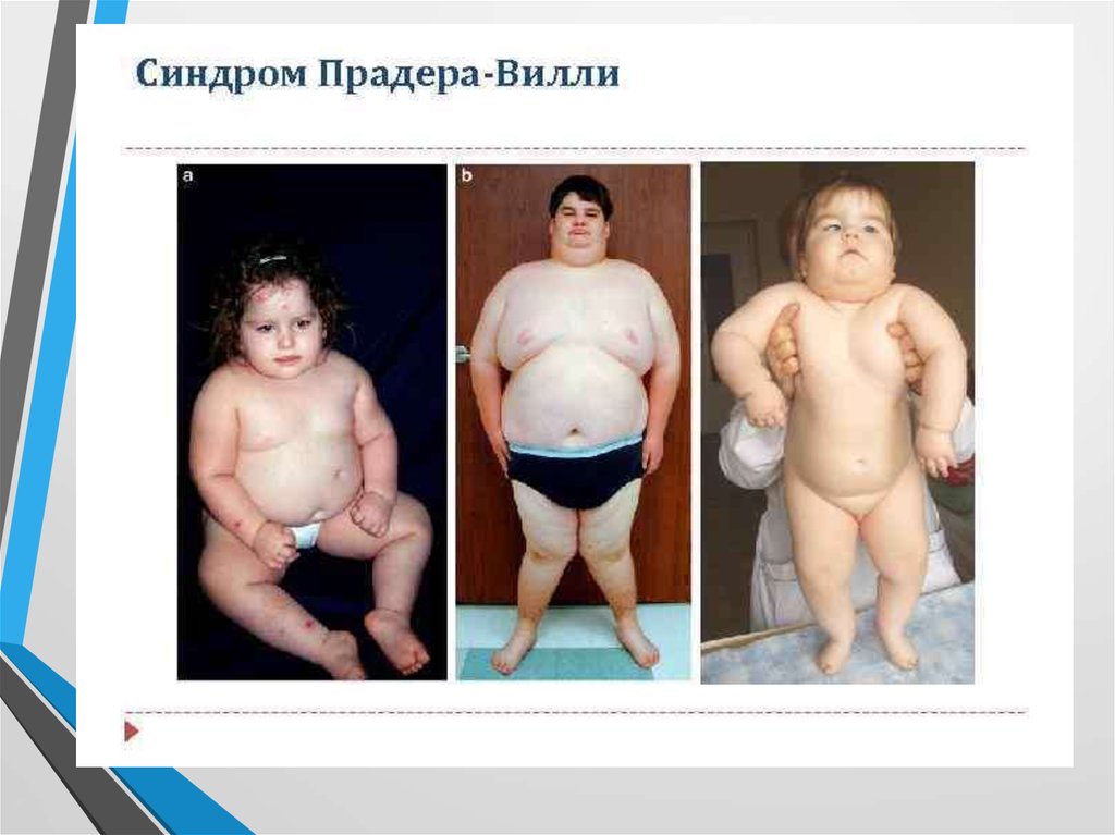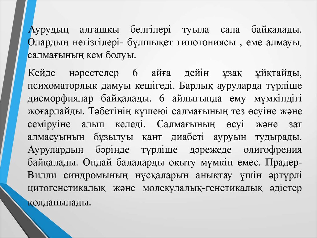 байқалады. Ондай балаларды оқыту мүмкін емес. ПрадерВилли синдромының нұсқаларын анықтау үшін әртүрлі
