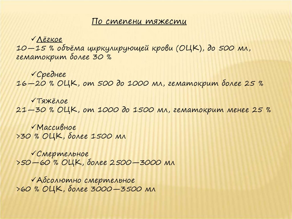16—20 % ОЦК, от 500 до 1000 мл, гематокрит более 25 %