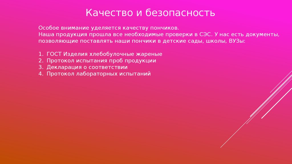 Качество и безопасностьОсобое внимание уделяется качеству пончиков.