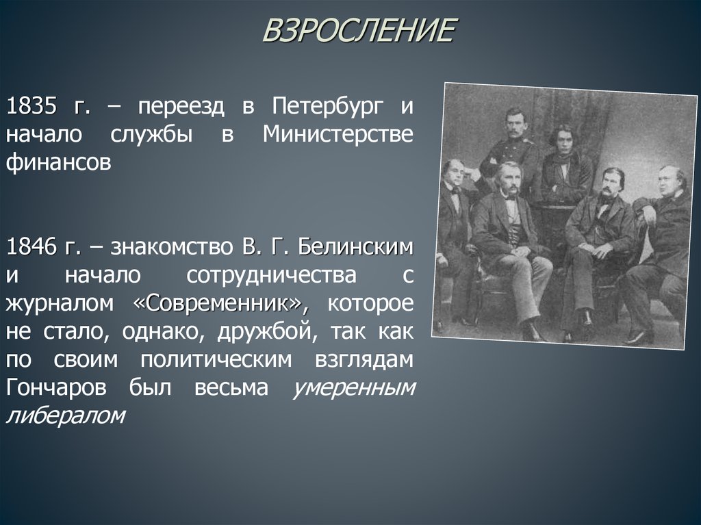 ВЗРОСЛЕНИЕ1835 г. – переезд в Петербург и