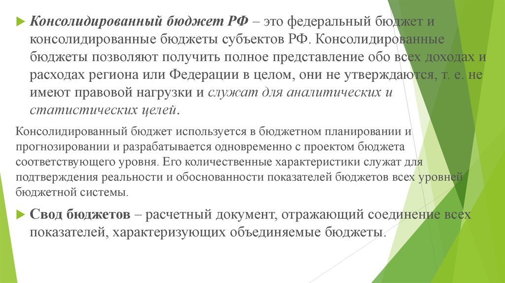 Консолидированный бюджет РФ – это федеральный бюджет иконсолидированные бюджеты субъектов РФ. Консолидированные