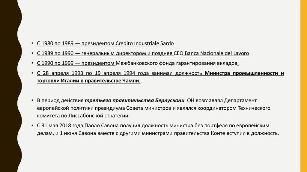 • С 31 мая 2018 года Паоло Савона получил должность министра без портфеля по европейским