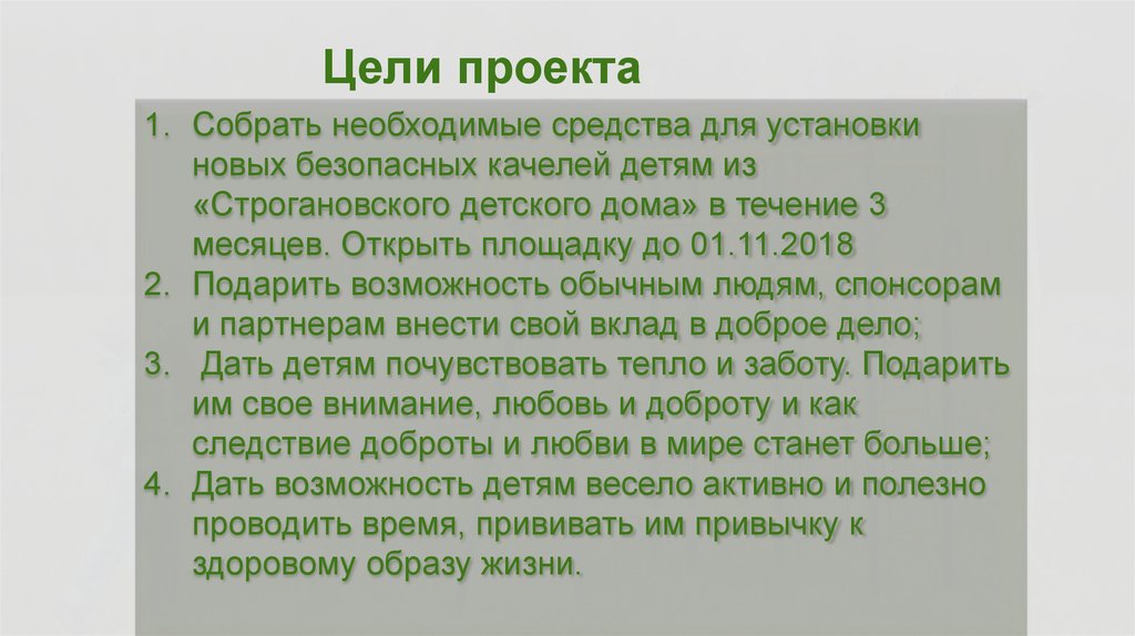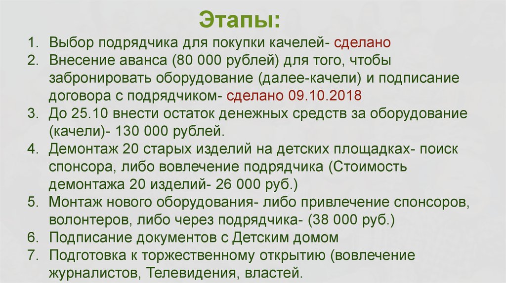 Этапы:1. Выбор подрядчика для покупки качелей- сделано