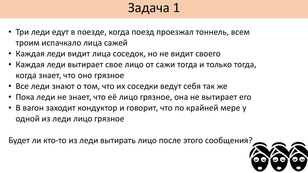Задача 1• Три леди едут в поезде, когда поезд проезжал тоннель, всем