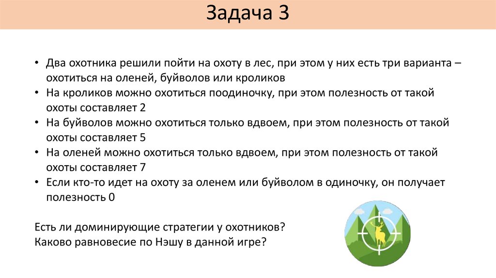 Задача 3• Два охотника решили пойти на охоту в лес, при этом у них есть три варианта –