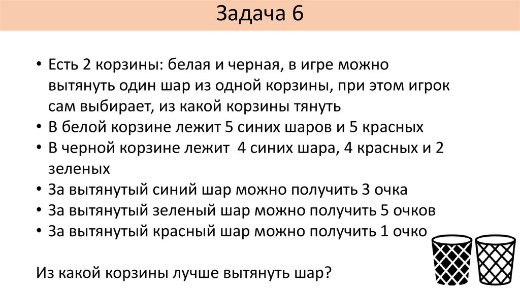 Задача 6• Есть 2 корзины: белая и черная, в игре можно