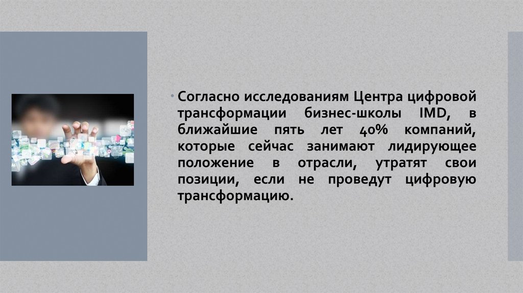 Согласно исследованиям Центра цифровойтрансформации бизнес-школы IMD, в