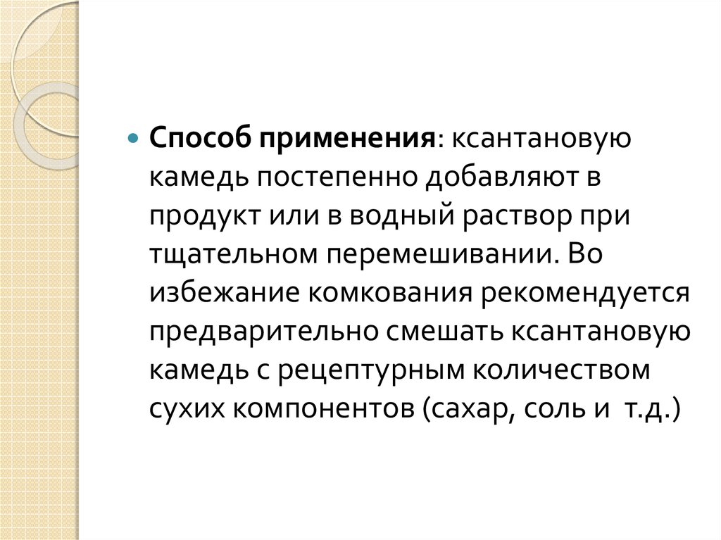 Способ применения: ксантановуюкамедь постепенно добавляют в
