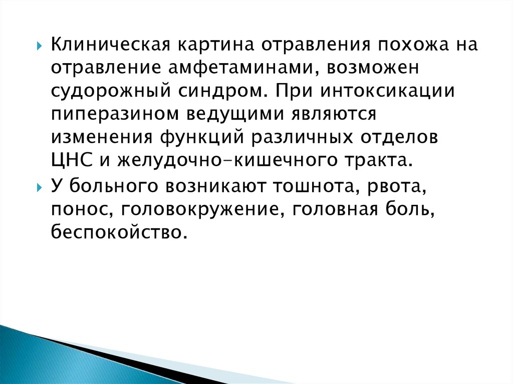 Клиническая картина отравления похожа наотравление амфетаминами, возможен