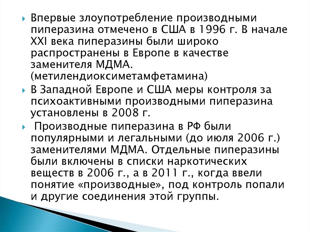 Впервые злоупотребление производнымипиперазина отмечено в США в 1996 г. В начале