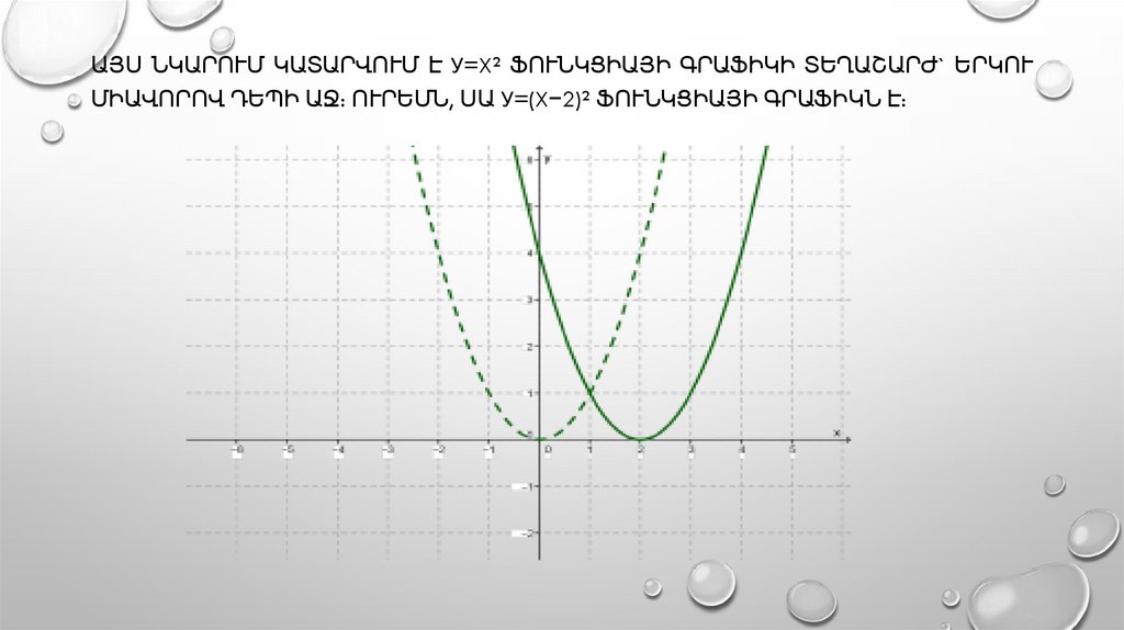 ԱՅՍ ՆԿԱՐՈՒՄ ԿԱՏԱՐՎՈՒՄ Է У=X² ՖՈՒՆԿՑԻԱՅԻ ԳՐԱՖԻԿԻ ՏԵՂԱՇԱՐԺ` ԵՐԿՈՒՄԻԱՎՈՐՈՎ ԴԵՊԻ ԱՋ: ՈՒՐԵՄՆ, ՍԱ У=(X−2)² ՖՈՒՆԿՑԻԱՅԻ ԳՐԱՖԻԿՆ Է: