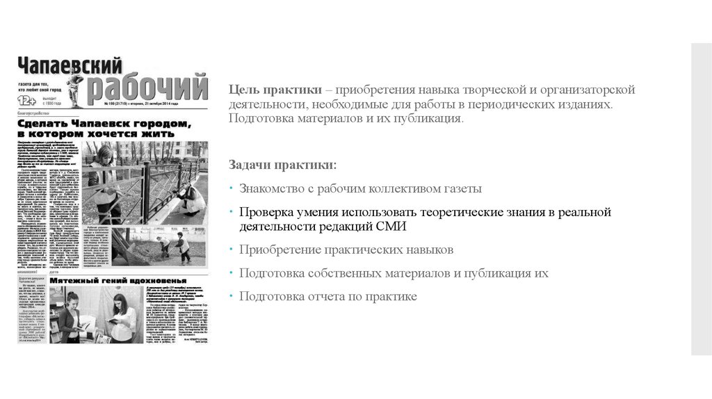 Цель практики – приобретения навыка творческой и организаторскойдеятельности, необходимые для работы в периодических изданиях.