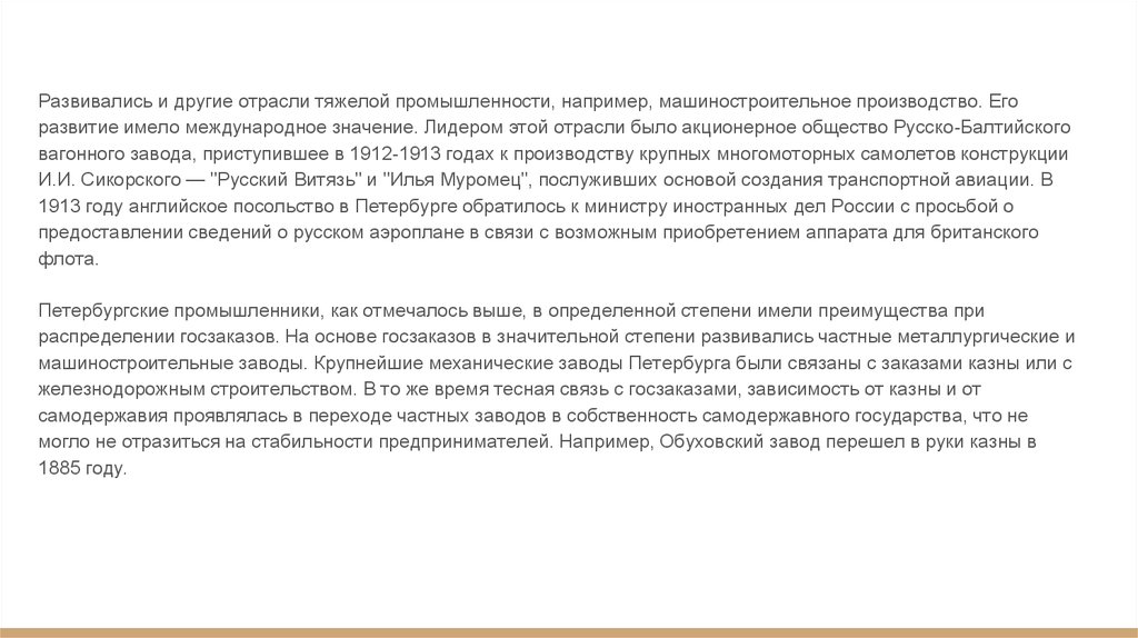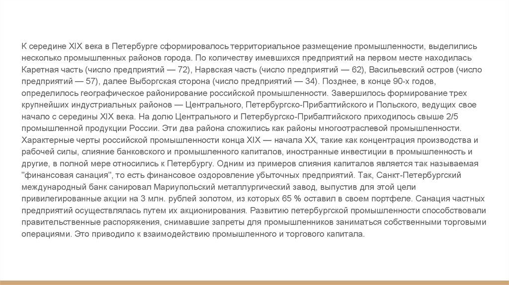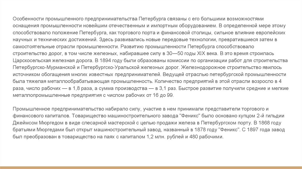 источником обогащения многих известных предпринимателей. Ведущей отраслью петербургской промышленности