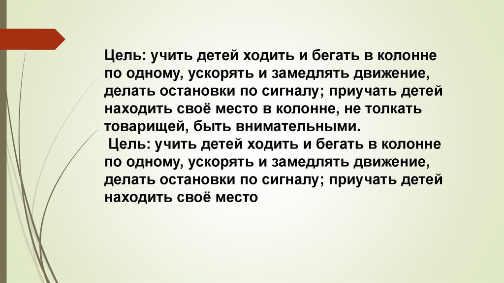 Цель: учить детей ходить и бегать в колоннепо одному, ускорять и замедлять движение,