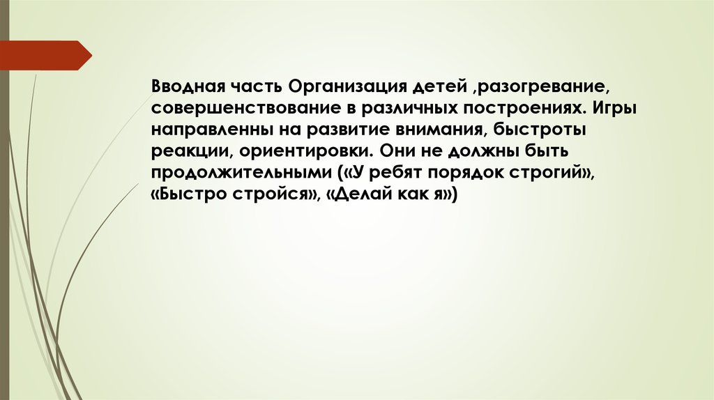 Вводная часть Организация детей ,разогревание,совершенствование в различных построениях. Игры