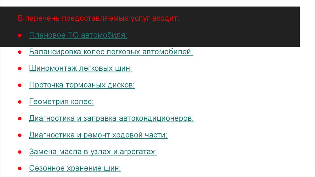 В перечень предоставляемых услуг входит:● Плановое ТО автомобиля;