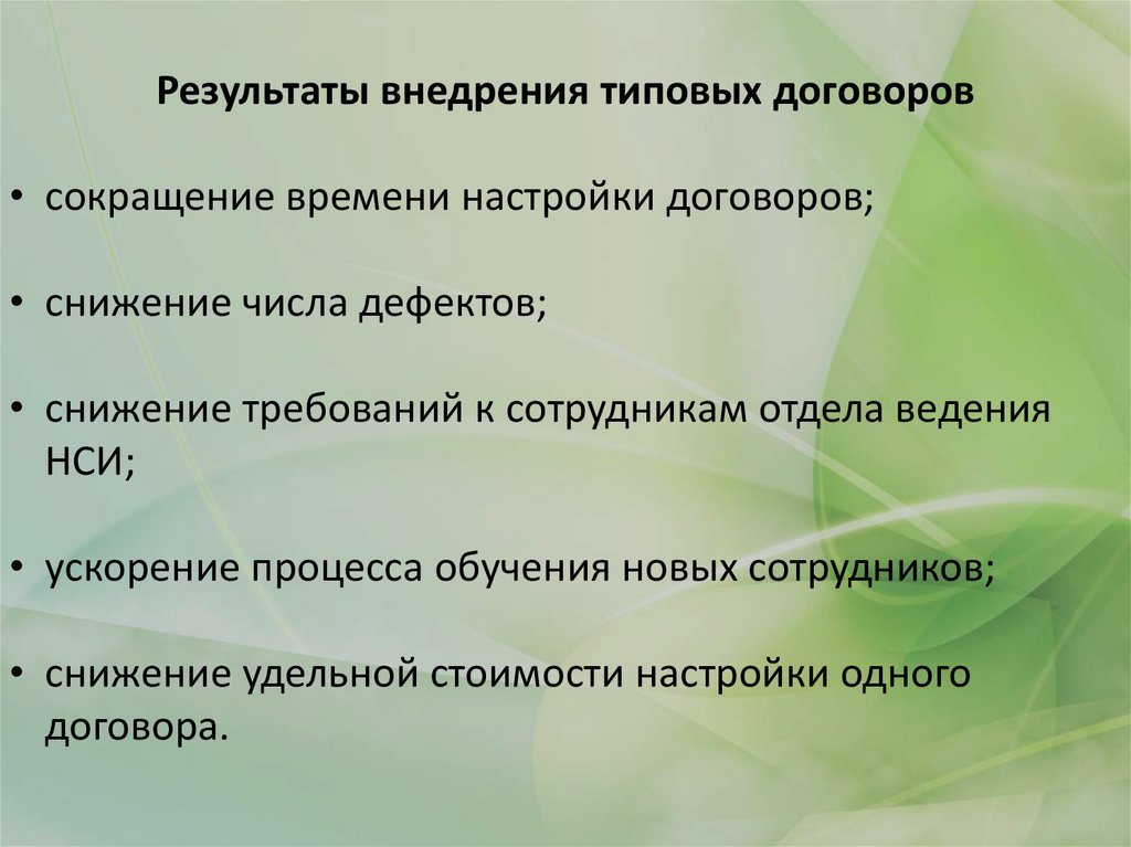 Результаты внедрения типовых договоров• сокращение времени настройки договоров;