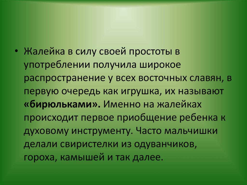 • Жалейка в силу своей простоты вупотреблении получила широкое