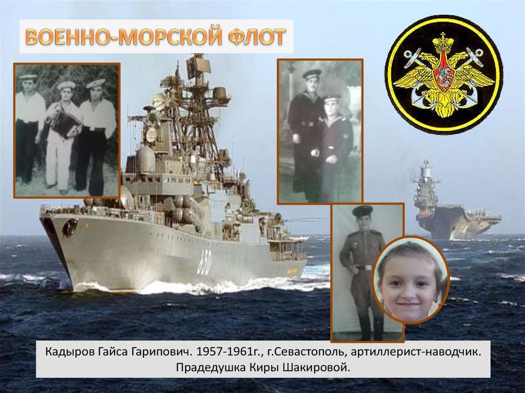 Кадыров Гайса Гарипович. 1957-1961г., г.Севастополь, артиллерист-наводчик.Прадедушка Киры Шакировой.