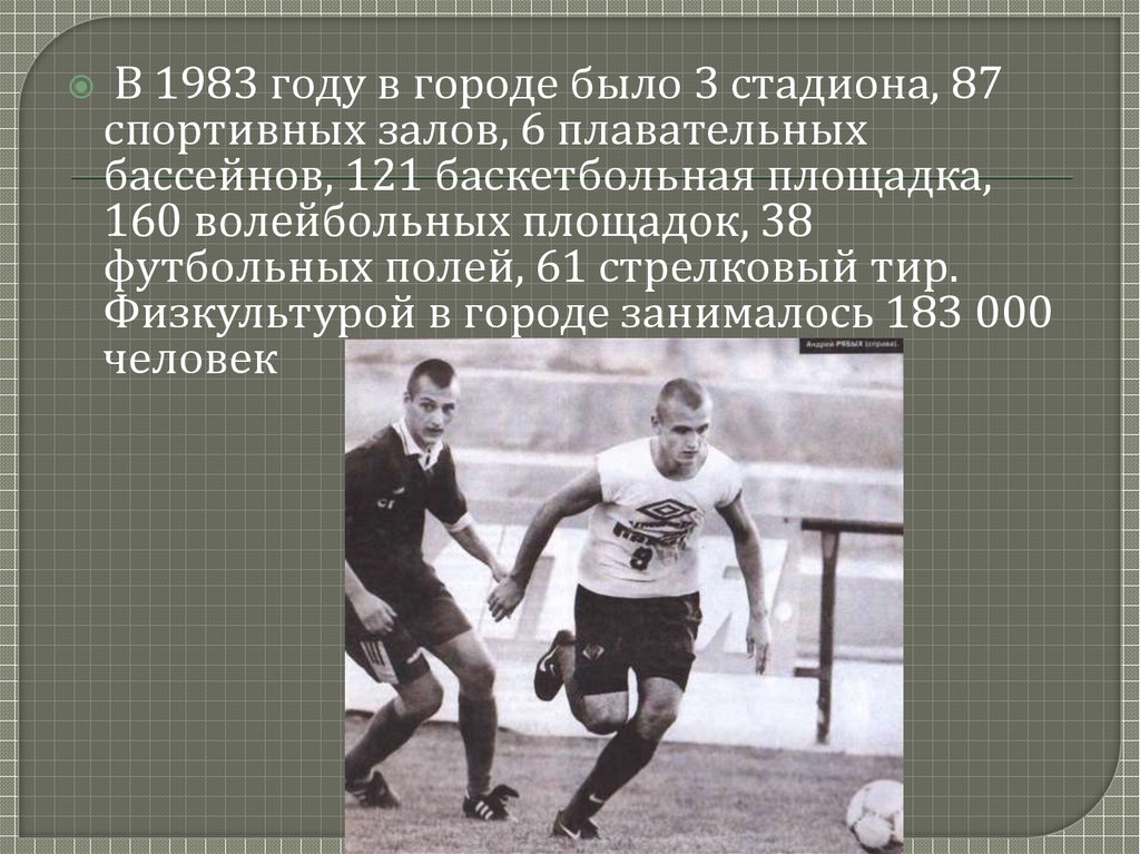 В 1983 году в городе было 3 стадиона, 87спортивных залов, 6 плавательных