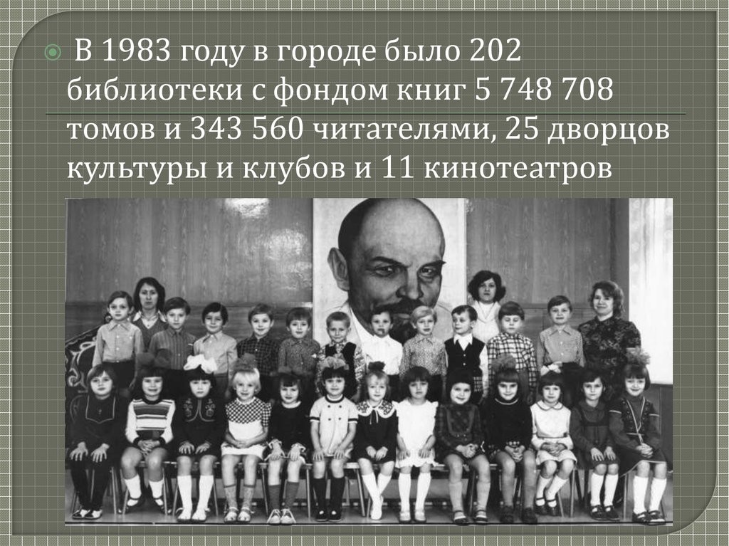 В 1983 году в городе было 202библиотеки с фондом книг 5 748 708