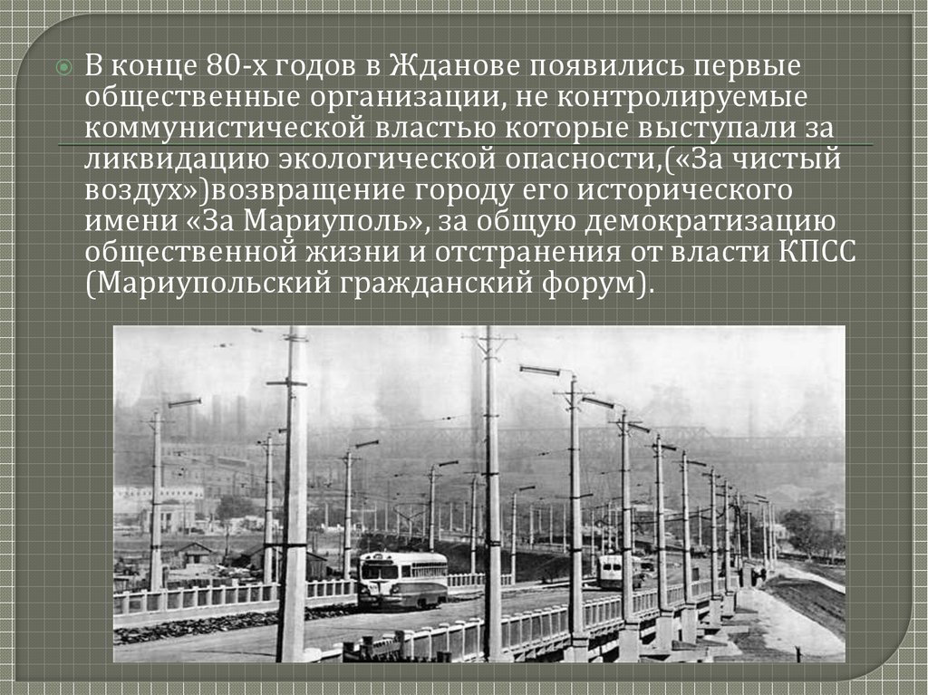 В конце 80-х годов в Жданове появились первыеобщественные организации, не контролируемые