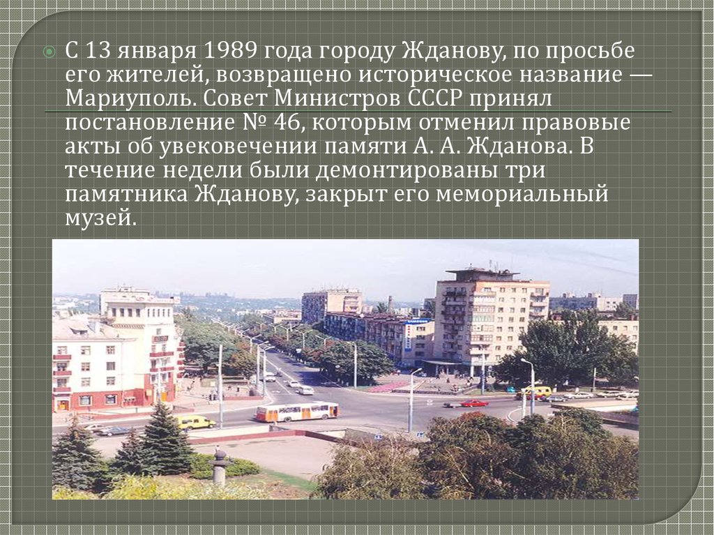 С 13 января 1989 года городу Жданову, по просьбеего жителей, возвращено историческое название —