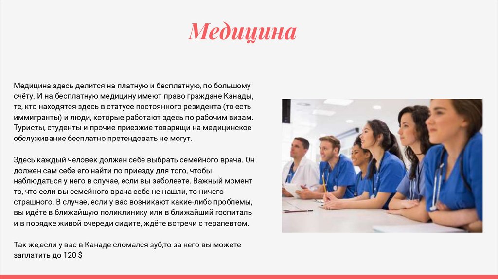 МедицинаМедицина здесь делится на платную и бесплатную, по большому