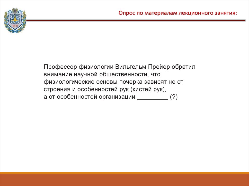 Опрос по материалам лекционного занятия:Профессор физиологии Вильгельм Прейер обратил