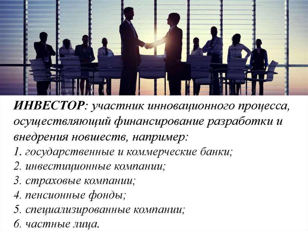 ИНВЕСТОР: участник инновационного процесса,осуществляющий финансирование разработки и