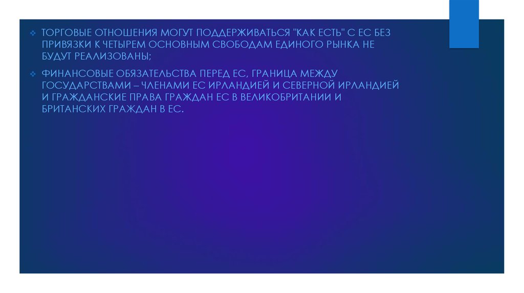 ТОРГОВЫЕ ОТНОШЕНИЯ МОГУТ ПОДДЕРЖИВАТЬСЯ "КАК ЕСТЬ" С ЕС БЕЗПРИВЯЗКИ К ЧЕТЫРЕМ ОСНОВНЫМ СВОБОДАМ ЕДИНОГО РЫНКА НЕ