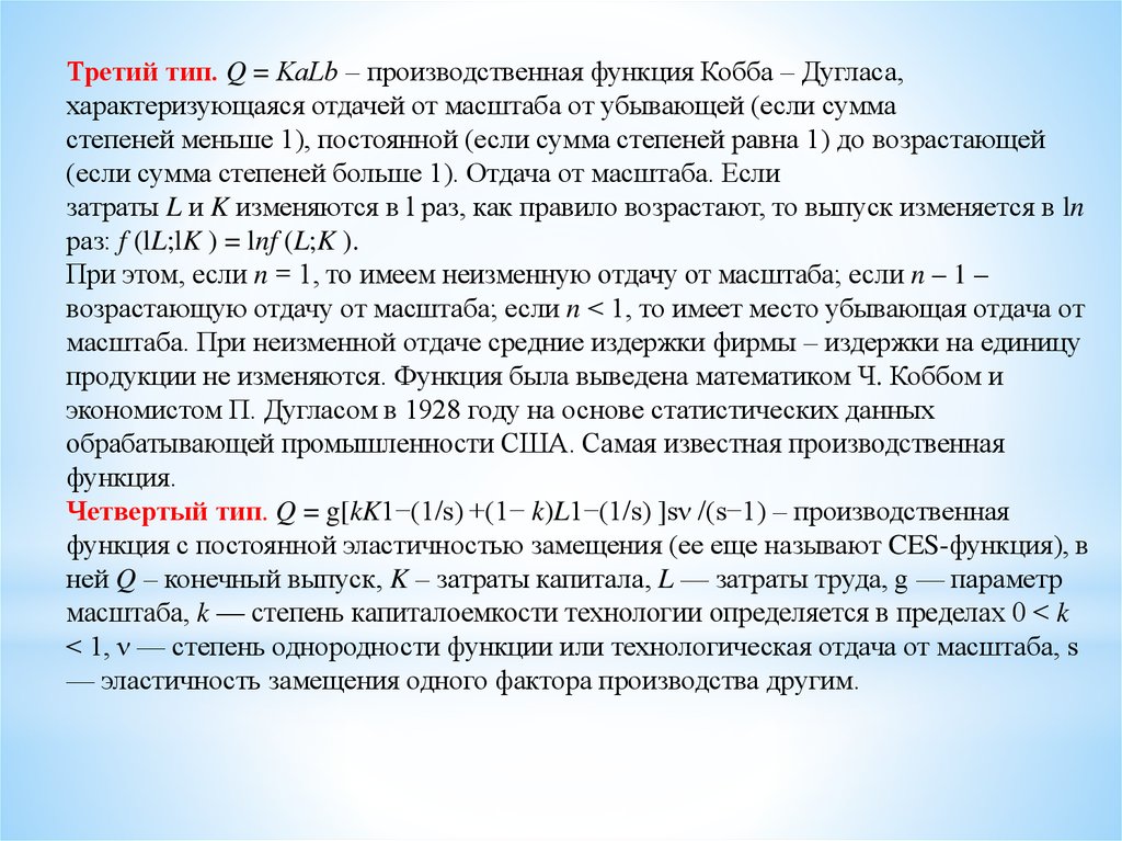 Третий тип. Q = KаLb – производственная функция Кобба – Дугласа,характеризующаяся отдачей от масштаба от убывающей (если сумма