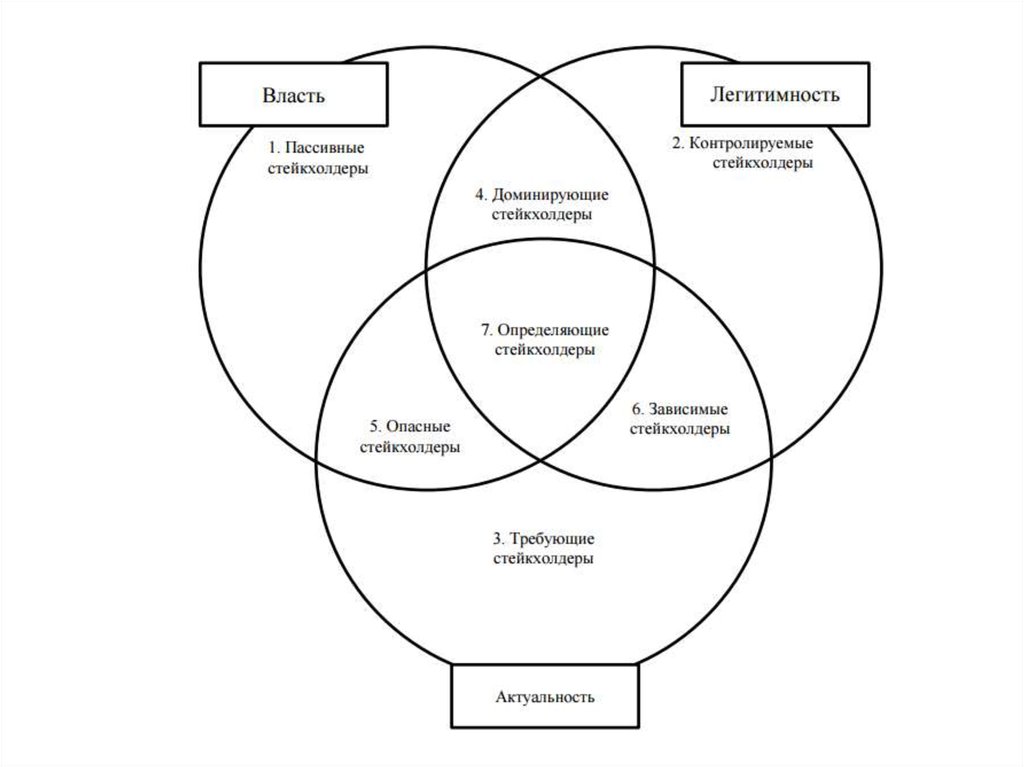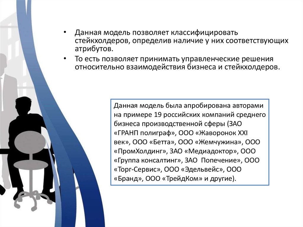 • Данная модель позволяет классифицироватьстейкхолдеров, определив наличие у них соответствующих