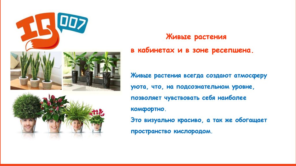Живые растенияв кабинетах и в зоне ресепшена.