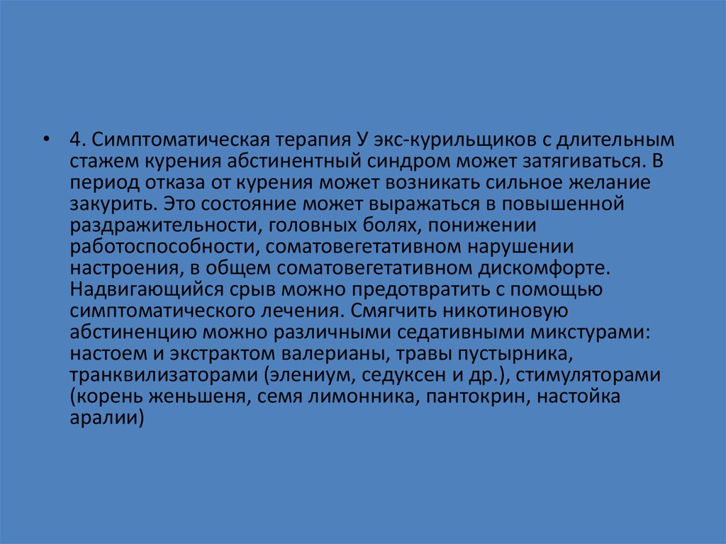• 4. Симптоматическая терапия У экс-курильщиков с длительнымстажем курения абстинентный синдром может затягиваться. В