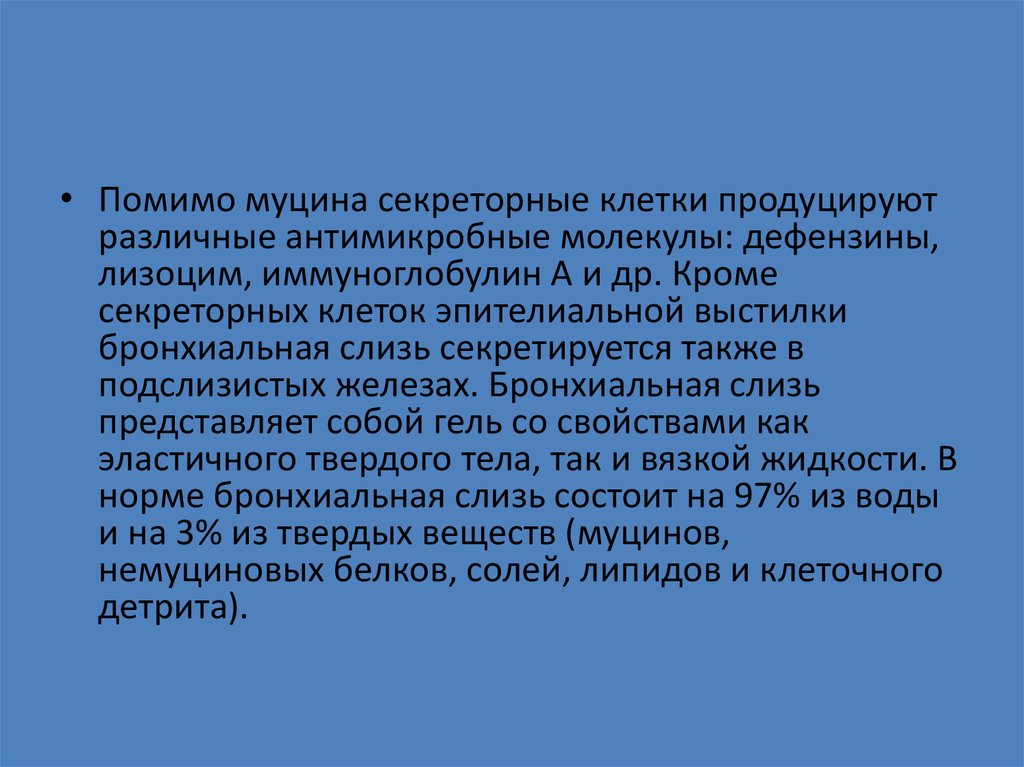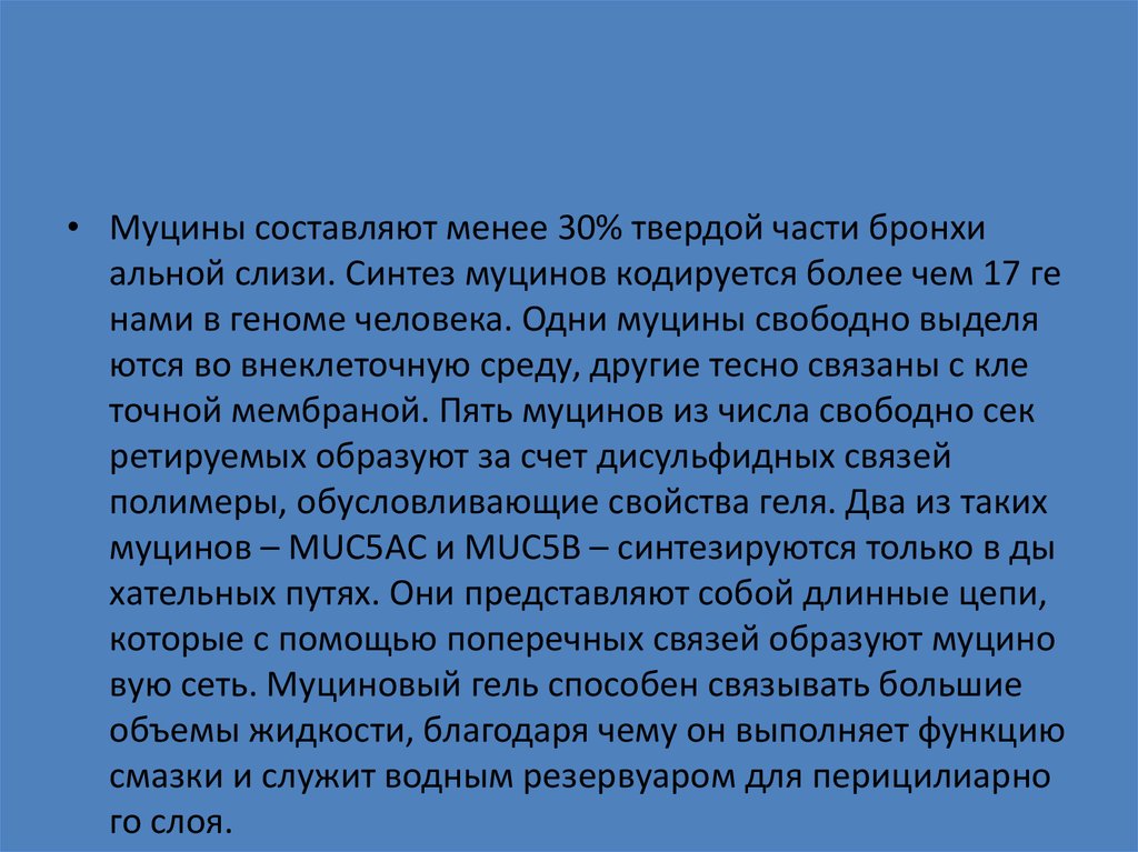 • Муцины составляют менее 30% твердой части бронхиальной слизи. Синтез муцинов кодируется более чем 17 ге