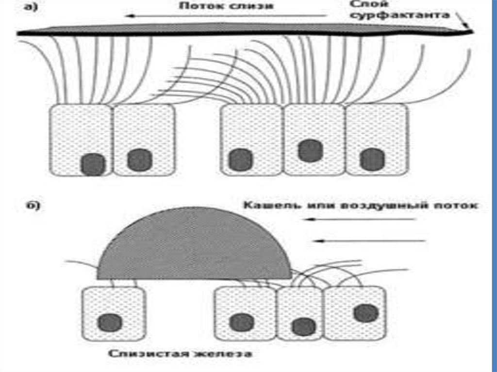 • Муциновый гель продвигается в проксимальном направлении за счетбиения ресничек. В составе муцинового слоя в связанном виде из