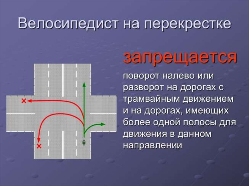 Всякие левые повороты, как и развороты для движения в обратном направлении, велосипедистам