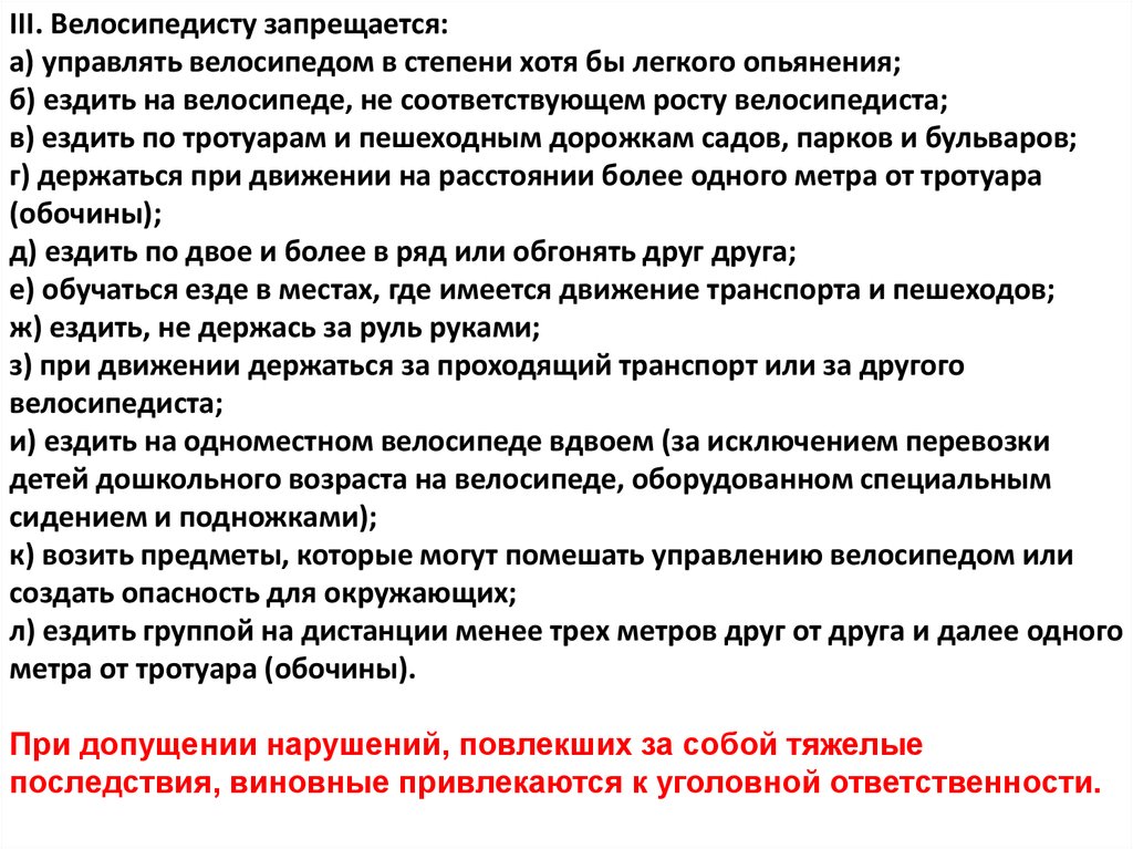 III. Велосипедисту запрещается:а) управлять велосипедом в степени хотя бы легкого опьянения;