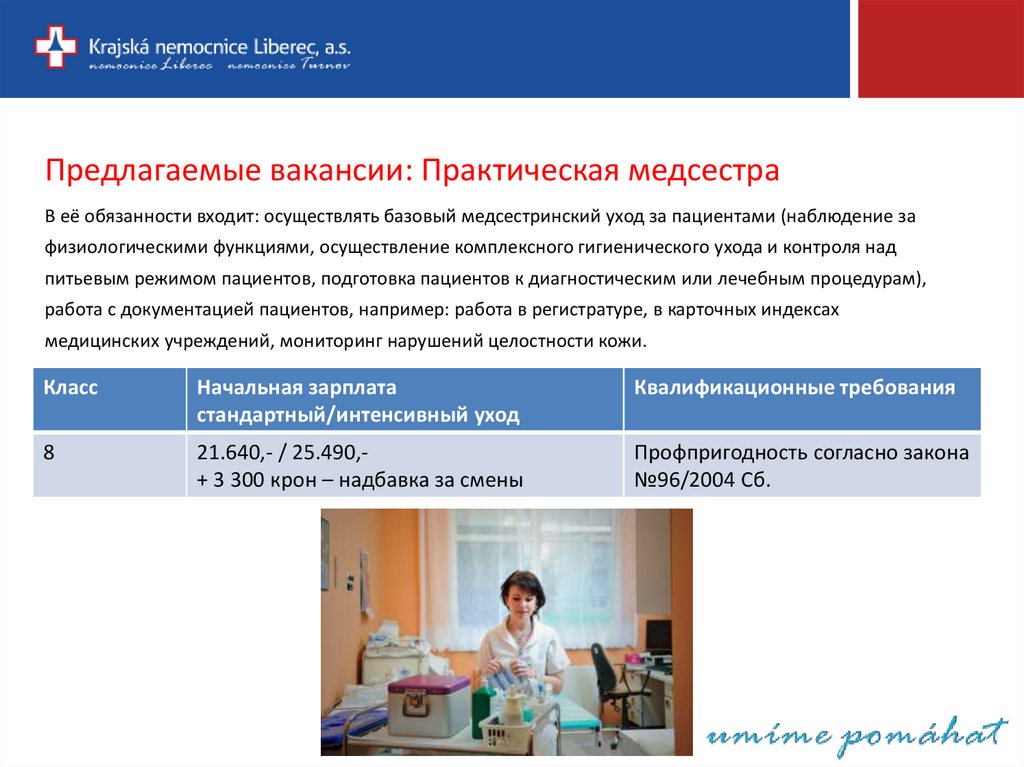 Предлагаемые вакансии: Практическая медсестраВ её обязанности входит: осуществлять базовый медсестринский уход за пациентами (наблюдение за