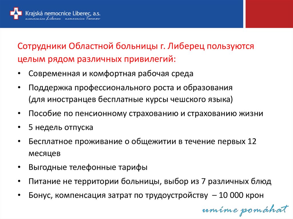 Сотрудники Областной больницы г. Либерец пользуютсяцелым рядом различных привилегий: