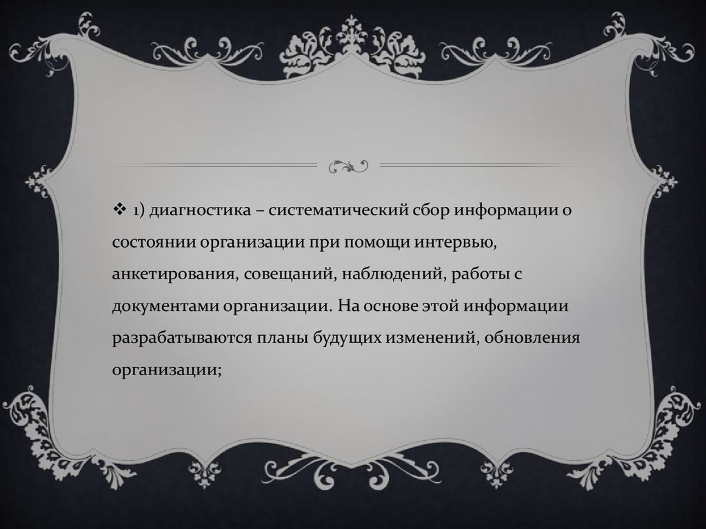 1) диагностика – систематический сбор информации осостоянии организации при помощи интервью,