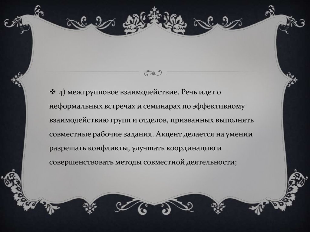 4) межгрупповое взаимодействие. Речь идет онеформальных встречах и семинарах по эффективному