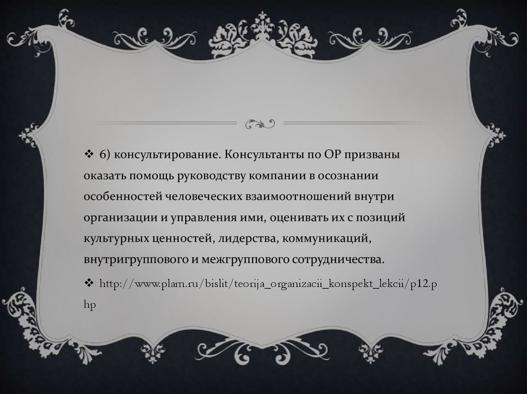 6) консультирование. Консультанты по ОР призваныоказать помощь руководству компании в осознании