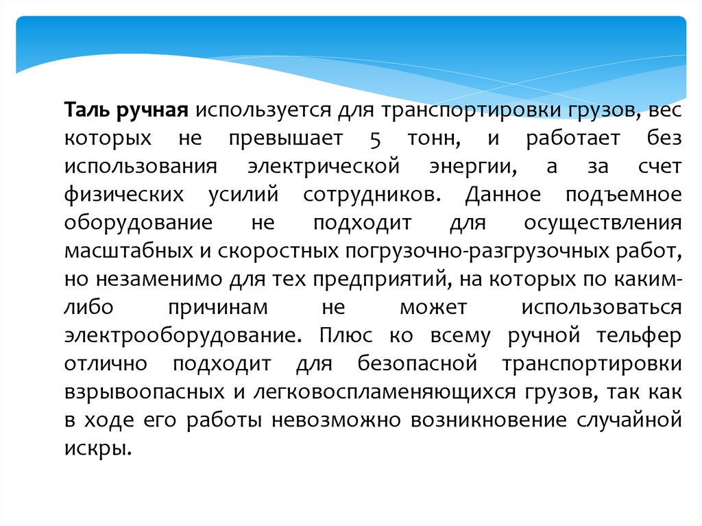 Таль ручная используется для транспортировки грузов, вескоторых не превышает 5 тонн, и работает без