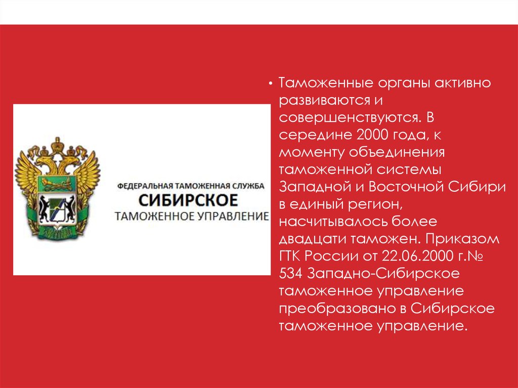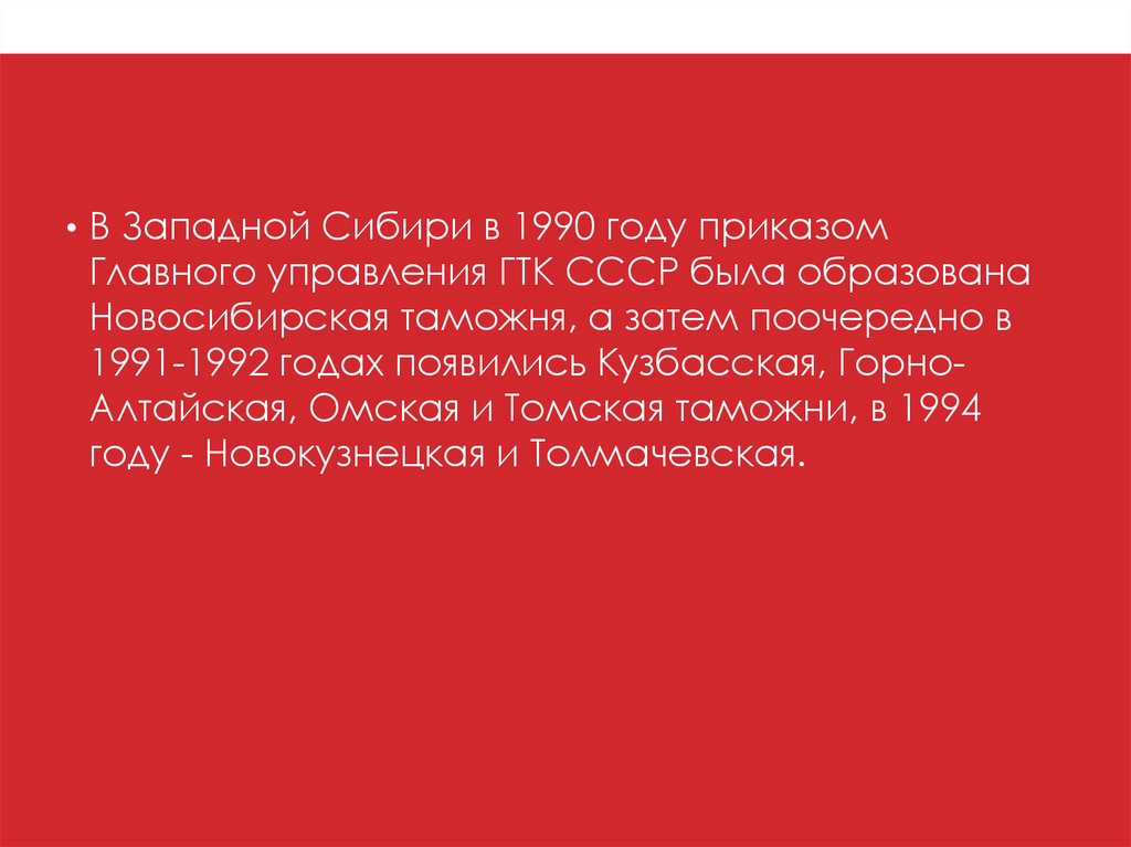 1991-1992 годах появились Кузбасская, ГорноАлтайская, Омская и Томская таможни, в 1994