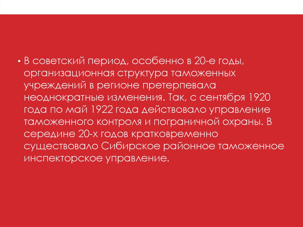 • В советский период, особенно в 20-е годы,организационная структура таможенных